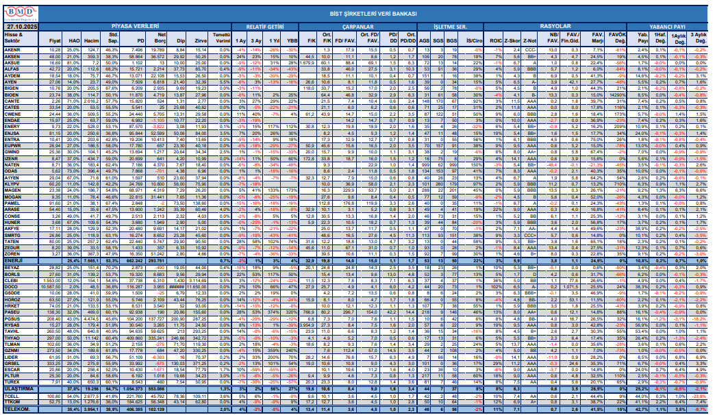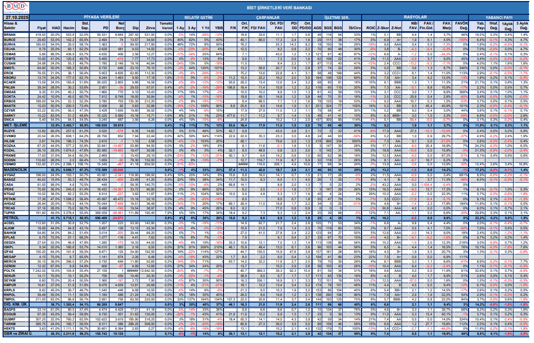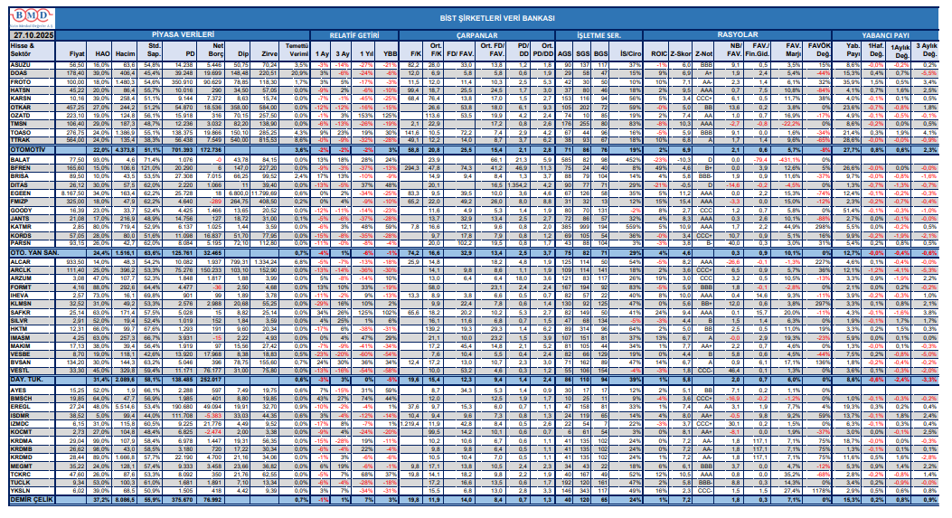 BMD Araştırma’nın raporunda göre, Borsa İstanbul’da işlem gören şirketlerin sektörleri, halka açıklık oranı, ortalama hacim, son bir yıllık dip ve zirve fiyatları gibi piyasa verilerini; BİST 100 endeksine göre göreceli getirilerini; F/K, FD/FAVÖK ve PD/DD çarpanlarının cari ve ortalama değerlerini; alacak stok ve borç gün süreleri ile işletme sermayesi/ciro oranını; ROIC, Z-Skor, Net Borç/FAVÖK gibi rasyoları ve yabancı payı değişimlerini gösteren veri bankası şu şekilde: