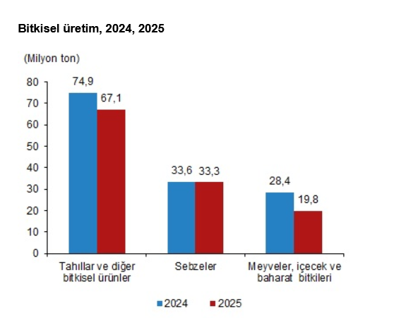 Türkiye İstatistik Kurumu (TÜİK) verilerine göre, üretim miktarlarının, 2025 yılı ikinci tahmininde bir önceki yıla göre tarla ürünleri olan tahıllar ve diğer bitkisel ürünlerde (yem bitkileri hariç) yüzde 10,4, sebzelerde yüzde 0,8, meyveler, içecek ve baharat bitkilerinde yüzde 30,4 oranında azalacağı tahmin edildi. Buna göre, yaklaşık üretim miktarlarının tahıllar ve diğer bitkisel ürünlerde 67,1 milyon ton, sebzelerde 33,3 milyon ton, meyveler, içecek ve baharat bitkilerinde ise 19,8 milyon ton olarak gerçekleşeceği öngörüldü.