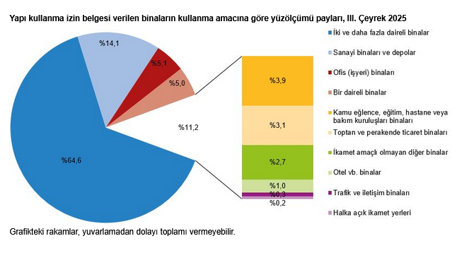 2025 yılı 3. çeyreğinde yapı kullanma izin belgesi verilen binaların kullanma amacına göre en yüksek yüzölçüm payına 21,5 milyon m² ile iki ve daha fazla daireli ikamet amaçlı binalar sahip oldu. Bunu 4,7 milyon m² ile sanayi binaları ve depolar izledi.