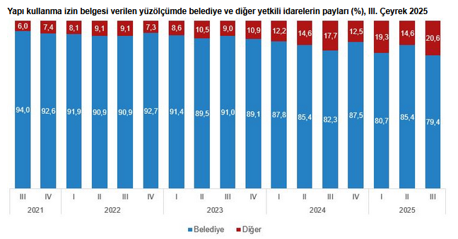 2025 yılı 3. çeyreğinde yapı kullanma izin belgesi verilen toplam yüzölçümün, yüzde 79,4'ü belediyer, yüzde 20,6'sı ise diğer yetkili idareler tarafından verildi.