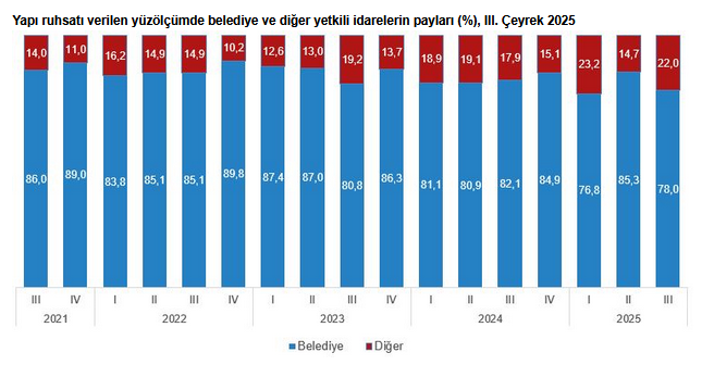 2025 yılı 3. çeyreğinde yapı ruhsatı verilen toplam yüzölçümün, yüzde 78,0'ı belediyeler, yüzde 22,0'ı ise diğer yetkili idareler tarafından verildi.