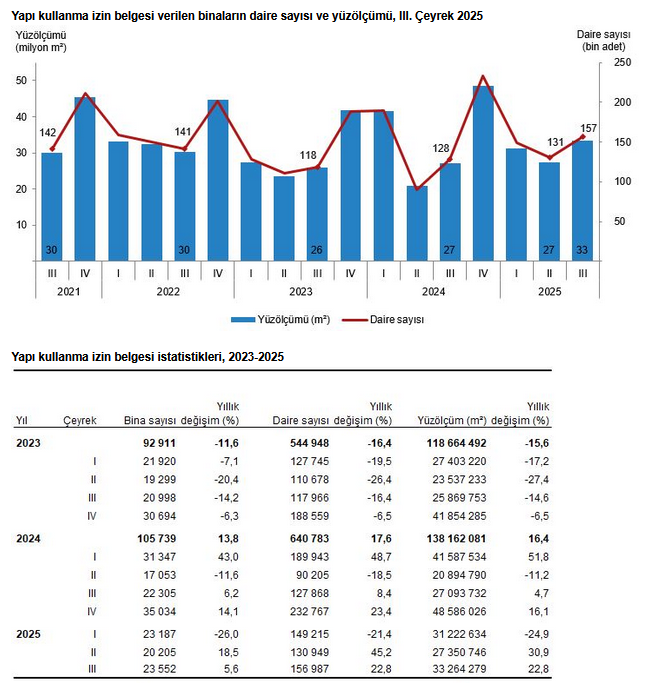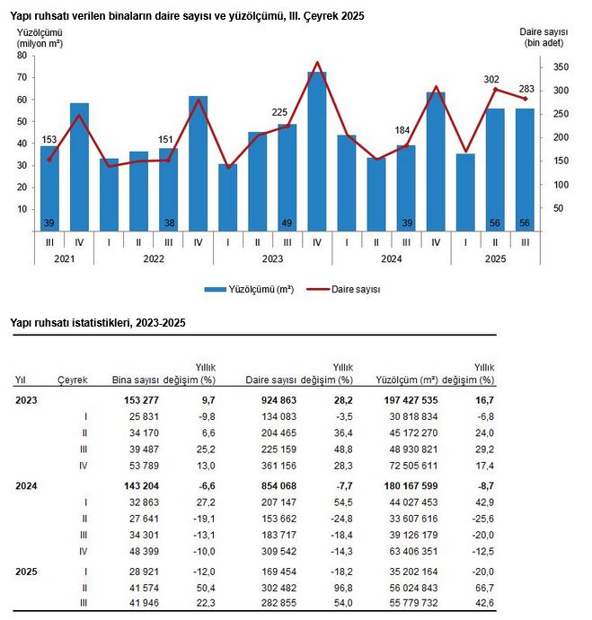 Türkiye İstatistik Kurumu (TÜİK) verilerine göre, bir önceki yılın aynı çeyreğine göre, 2025 yılı 3. çeyreğinde yapı ruhsatı verilen bina sayısı yüzde 22,3, daire sayısı yüzde 54,0 ve yüzölçüm yüzde 42,6 arttı.