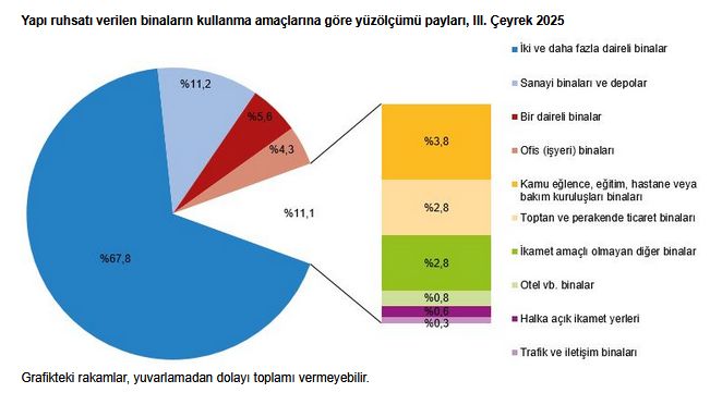 2025 yılı 3. çeyreğinde yapı ruhsatı verilen binaların kullanma amacına göre en yüksek yüzölçüm payına 37,8 milyon m² ile iki ve daha fazla daireli ikamet amaçlı binalar sahip oldu. Bunu 6,2 milyon metrekare ile sanayi binaları ve depolar izledi.