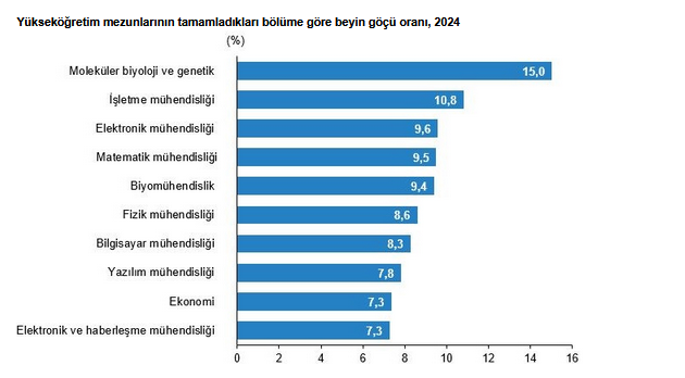 Mezunların beyin göçü oranları incelendiğinde, en yüksek beyin göçü oranına sahip lisans programları sırasıyla, moleküler biyoloji ve genetik (yüzde 15,0), işletme mühendisliği (yüzde 10,8), elektronik mühendisliği (yüzde 9,6), matematik mühendisliği (yüzde 9,5) ve biyomühendislik (yüzde 9,4) oldu.