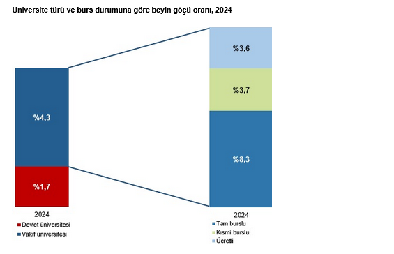 Devlet üniversitesi mezunlarında beyin göçü oranı 2023 yılında yüzde 1,7 iken, 2024 yılında değişmeyerek aynı kaldı. Vakıf üniversitesi mezunlarında beyin göçü oranı 2023 yılında yüzde 4,5 iken, 2024 yılında yüzde 4,3 oldu. Vakıf üniversitesi mezunları arasında 2024 yılında en yüksek beyin göçü oranı yüzde 8,3 ile tam burslu eğitim alanlarda gözlemlenirken, bu sırayı yüzde 3,7 ile kısmi burslu eğitim alanlar ve yüzde 3,6 ile ücretli eğitim alanlar izledi.