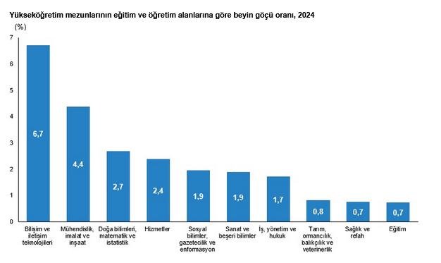 En yüksek beyin göçü oranına sahip eğitim ve öğretim alanları bilişim ve iletişim teknolojileri (yüzde 6,7), mühendislik, imalat ve inşaat (yüzde 4,4) ve doğa bilimleri, matematik ve istatistik (yüzde 2,7) oldu.