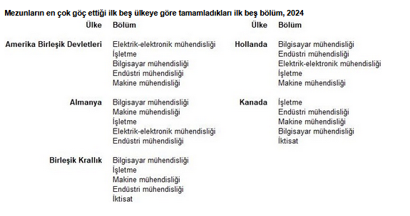 Amerika Birleşik Devletleri'ne göç eden mezunlar içinde en büyük paya sahip lisans programı elektrik-elektronik mühendisliği olurken, Almanya, Birleşik Krallık ve Hollanda'yı en fazla tercih eden mezunlar bilgisayar mühendisliği bölümünden oldu. Kanada'ya göç etmeyi tercih eden mezunlar arasında en fazla paya sahip olan lisans programı işletme oldu.