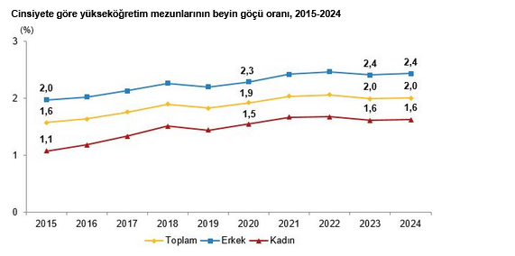 Türkiye İstatistik Kurumu (TÜİK) verilerine göre, yükseköğretim mezunlarının beyin göçü oranı 2024 yılında bir önceki yıla göre değişmeyerek yüzde 2,0 oldu. Beyin göçü oranı kadınlarda yüzde 1,6, erkeklerde ise yüzde 2,4 olarak gerçekleşti.